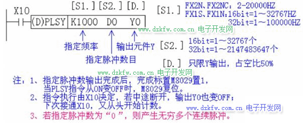 PLSY 指令用于產生指定數量的脈沖。 助記法為 HZ、數目 Y 出來。 指令執行如下: