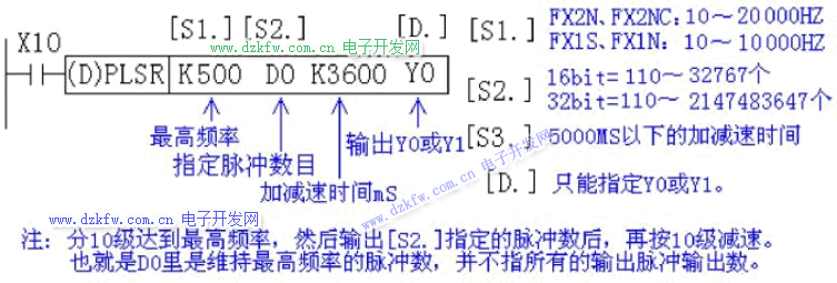 2、 帶加減速的脈沖輸出指令 PLSR(FNC59)