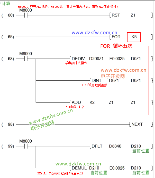 M8000常通觸點段開M0,當進入PLC下一個工作周期時,由于循環指令里面的程序都是由M0常開觸點觸發的,這是就不會再觸發了,也就是,經過一個PLC的工作周期,就把D0到D9里面的數據加起來,放到了D10里面了。