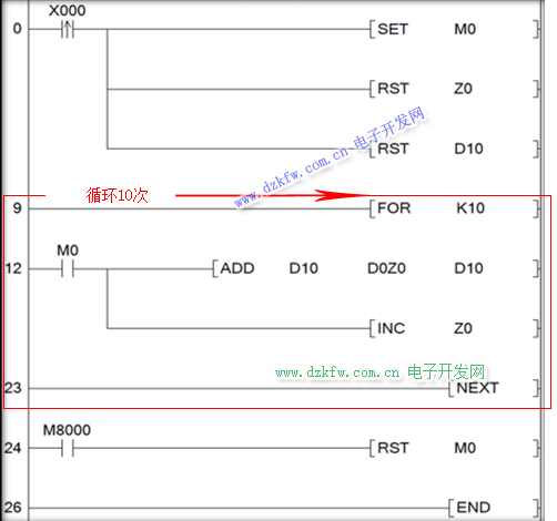 程序的0到9步,觸發X0的上升沿信號,把M0導通,Z0、D10全部清空;第9到23步,是一段循環指令,FOR K10表示這段程序循環10遍。