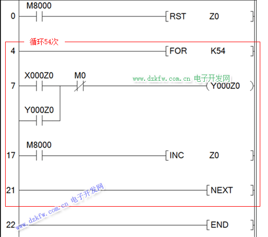 每次進行掃描都會先把Z0清0,然后進入循環(54次),第一遍Z0=0,這時X000Z0的地址是X000,Y000Z0的地址是Y000,X000觸發Y000線圈并形成自鎖,通過INC指令Z0自加1;第二遍,Z0等于1,這時X000Z0的地址是X001,Y000Z0的地址是Y001,X001觸發Y001線圈并形成自鎖,通過INC指令Z0自加1;… …