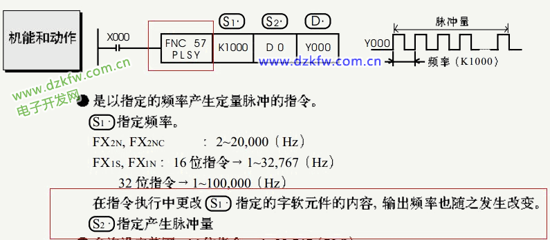 K1000:指定的輸出脈沖頻率,可所以T,C,D,數值或是位元件組合如K4X0 D0:指定的輸出脈沖數,可所以T,C,D,數值或是位元件組合如K4X0,當該值為0時,輸出脈沖數不受綁縛 。Y0:指定的脈沖輸出端子,只能是Y0或Y1 。