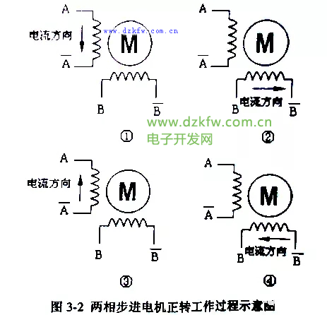 根據(jù)這個(gè)原理,如圖3-2所示,兩相步進(jìn)電機(jī)的轉(zhuǎn)動(dòng)步驟,以正轉(zhuǎn)為例: