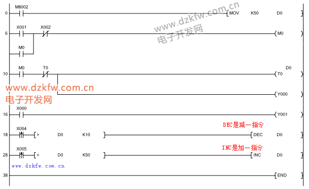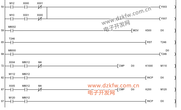 5、當(dāng)X5為ON,如D0大于200,每100ms對(duì)D0減1,從而縮短每脈沖輸出的時(shí)間間隔,加快電機(jī)的轉(zhuǎn)速;