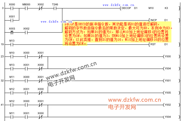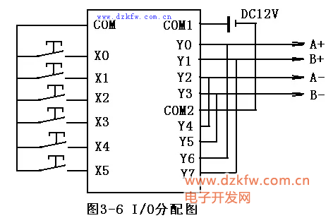 X1為ON時(shí),輸出反脈沖列,步進(jìn)電機(jī)正轉(zhuǎn)。當(dāng)X1為ON時(shí),T246以D0值為預(yù)置值開始計(jì)時(shí),時(shí)間到,T246導(dǎo)通,執(zhí)行DECO指令,根據(jù)D1數(shù)值(首次為0),指定M10輸出,Y3、Y7為ON,步進(jìn)電機(jī)B相通電,且實(shí)現(xiàn)電流方向B-→B+;依此類推,完成實(shí)現(xiàn)A相反方向電流、B相正方向電流、A相正方向電流三個(gè)脈沖列輸出;當(dāng)M13為ON,D1復(fù)位,重新開始新一輪正脈沖系列的產(chǎn)生。