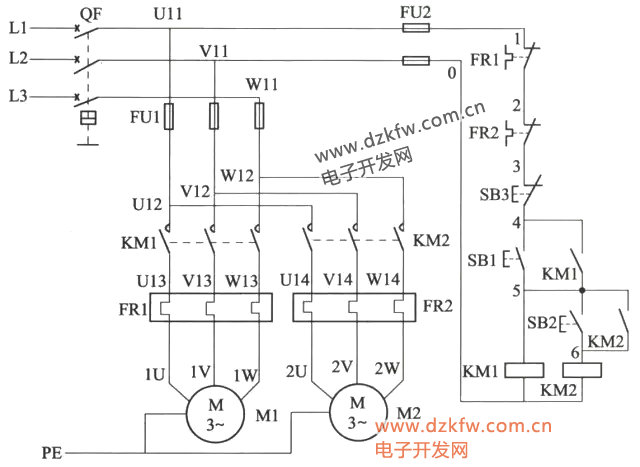 2)按下停止按鈕SB3,三相異步電動機M1、M2同時停止運轉;