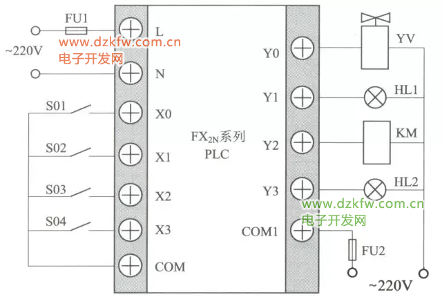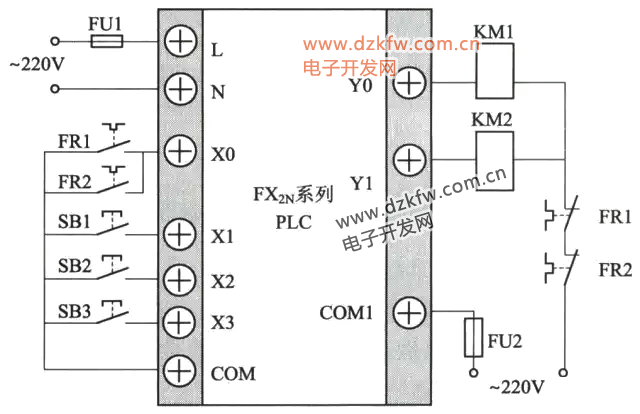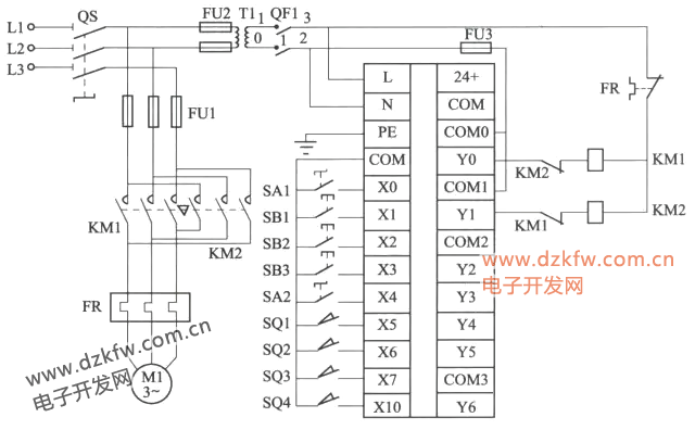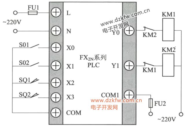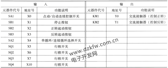 由圖可見,該控制器控制對象時工作臺,其工作方式有前進和后退,電動機正轉時,通過絲杠使工作臺前進;電動機反轉時,通過絲杠使工作臺后退。因此,基本控制程序是正反轉控制程序。
