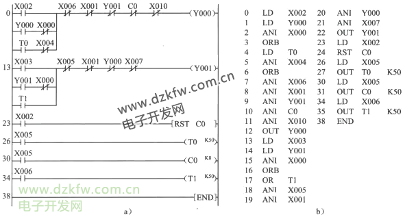 在本例程序中,采用開關SA1(X0)實現點動/自動控制轉換,即利用輸入繼電器X0常閉觸點與實現自鎖控制的常開觸點Y0、Y1串聯,實現點動/自動控制的選擇。SA1閉合時,X0常閉觸點斷開,使Y0、Y1失去自鎖作用,從而實現系統的點動控制。此時電動機工作狀態由按鈕SB2、SB3控制。