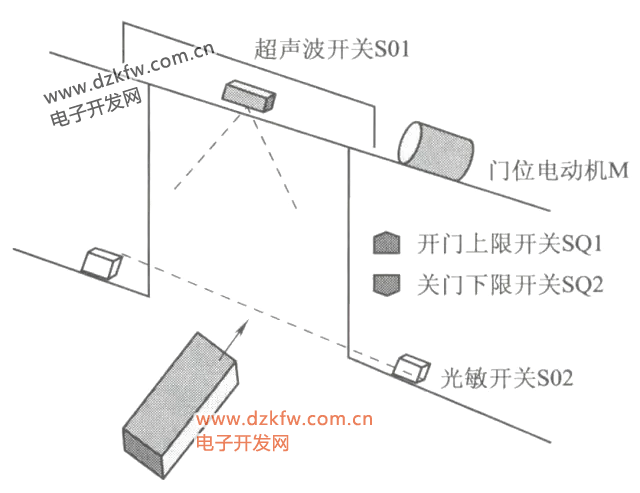 1)當行人(車)進入超聲波發射范圍內,開關便檢測出超聲回波,從而產生輸出電信號(S01=ON),由該信號起動接觸器KM1,電動機M正轉使卷簾上升開門。