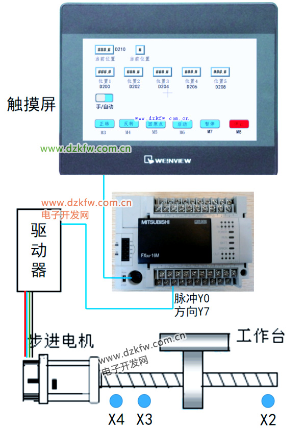 一臺威綸通觸摸屏與三菱FX3U的PLC相連,PLC下方配備了一臺步進電機。當前的任務是編寫控制程序,實現對步進電機的有效控制。該步進電機具有8度的步距角,螺距為2mm,且已設置細分參數為4。此外,XX4和X3分別代表負極限、原點和正極限。