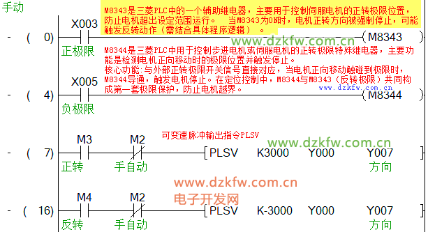 M8343和M8344作為Y0軸的正負極限特殊繼電器,與外部信號一一對應,確保電機在觸及相應極限時能及時停止。在手動模式M2斷開時,其常閉觸點將導通,此時,觸摸屏上的正反轉按鈕M3和M4可控制可變速脈沖輸出指令,從而實現對電機的正反轉控制,且頻率固定為3000HZ。