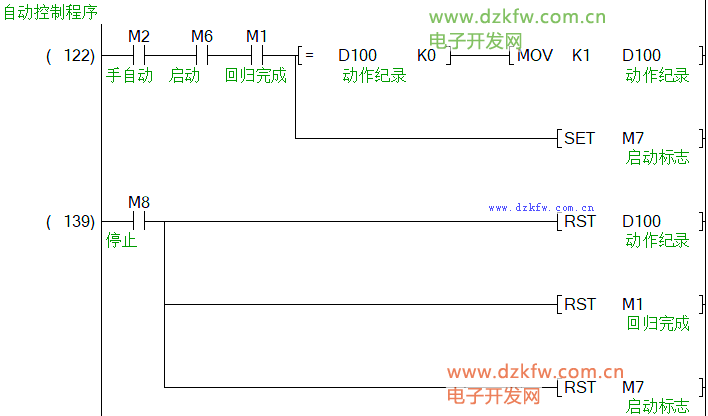 在手動操作模式下,當系統完成回原點動作且D100=0時,將執行第一步動作,即激活M7啟動標志位,隨后程序將按順序執行。若按下停止按鈕,D100將被復位,同時原點回歸完成標志也將被重置,啟動標志隨之解除。接下來,我們將探討順序控制的相關內容。