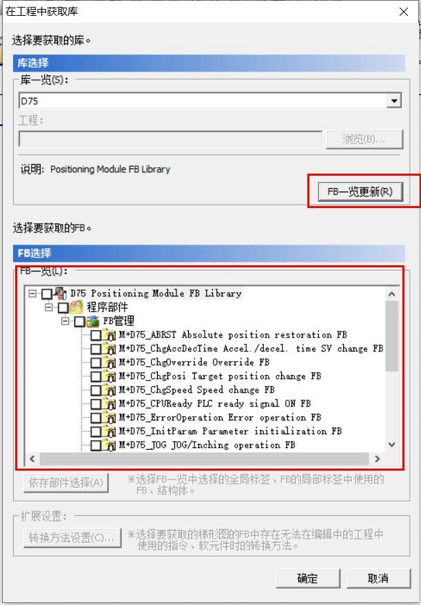 7,按FB一覽更新,勾選定位模塊D75你要用到的功能程序塊。