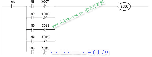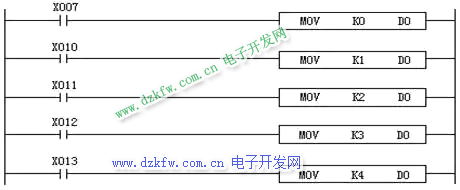 在該程序中,5個站的行程開關(guān)分別用數(shù)字0-4 來表示,當(dāng)小車在1號站時,行程開關(guān)X007得電,將數(shù)字0傳送到數(shù)據(jù)寄存器D0;當(dāng)小車在2號站時,行程開關(guān)X010得電,將數(shù)字1傳送到數(shù)據(jù)寄存器D0。依次類推,當(dāng)小車在5號站時,行程開關(guān)X007得電,將數(shù)字4傳送到數(shù)據(jù)寄存器D0。它所對應(yīng)的梯形圖如圖6-1所示: