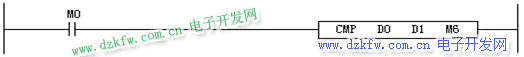 按下啟動按鈕和呼叫按鈕后,開始對行程開關(guān)數(shù)據(jù)寄存器D0和呼叫按鈕數(shù)據(jù)寄存器D1中的數(shù)據(jù)進行比較。當(dāng)(D0)>(D1)時,即小車當(dāng)前所處停靠站的編碼大于呼叫按鈕的編碼時,M6得電,小車向左運行;當(dāng)(D0)=(D1)時,即小車當(dāng)前所處?空镜木幋a等于呼叫按鈕的編碼時,M7得電,小車停止不動;當(dāng)(D0)<(D1)時,即小車當(dāng)前所處?空镜木幋a小于呼叫按鈕的編碼時,M8得電,小車向右運行。它所對應(yīng)的梯形圖如圖6-4所示: