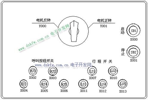 這個控制系統(tǒng)的輸入有啟動按鈕開關(guān)、停止按鈕開關(guān)、5個呼叫按鈕開關(guān)、5個行程開關(guān)共12輸入點。具體的輸入分配如表4-2 所示: