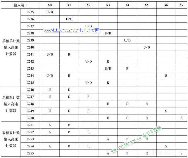 輸入表描述:U為加計數輸入,D為減計數輸入,B為B相輸入,A為A相輸入,R為復位輸入,S為啟動輸入。X6、X7只能用作啟動信號,而不能用作計數信號。