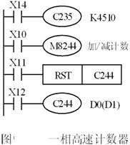 C235~C240為一相無起動/復位輸入端的高速計數器,C24l~C245為一相帶起動/復位端的高速計數器,可用M8235~M8245來設置C235~C2415的計數方向,M為ON時為減計數,為OFF時為加計數。C235~C240只能用RST指令來復位。