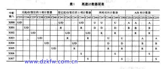 表1給出了各高速計數器對應的輸入端子的元件號,表中的U、D分別為加、減計數輸入,A、B分別為A、B相輸入,R為復位輸入,S為置位輸入。
