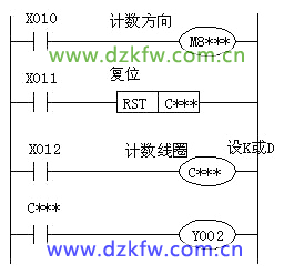 當X010為ON時,對應C***的M8***也ON,這時C***為減計數。