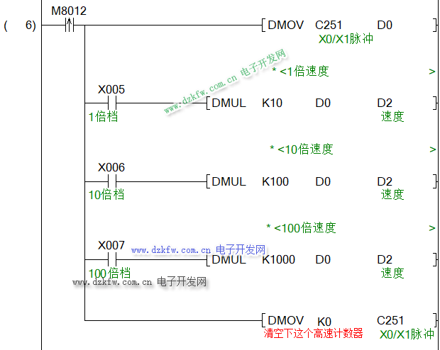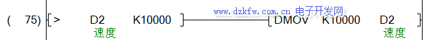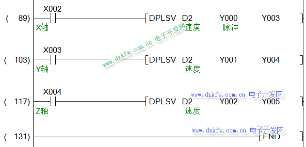 (4)最后面,使用可變速脈沖輸出指令控制,不同的軸的X點對應不同的Y點進行輸出,頻率采用前面計算出來的D2進行控制。