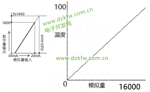 四、 三菱PLC模擬信號采集分析 分析:利用PT100鉑熱電阻進行溫度模擬量采集,是要先把電阻信號通過變送器轉換成4-20mA的電流信號,將電流信號傳送到模擬量采集模塊,本案例采用的是FX3U-4AD模塊,傳感器的測溫范圍是0-100度,對應的模擬量我們選用模式3(4mA~20mA→0~16000),1度對應的模擬量為160,系數為160。