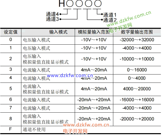 設定通道模式常用模式有(電壓輸入,-10V~+10V→-32000~+32000),(電流輸入,4mA~20mA→0~16000模式)。