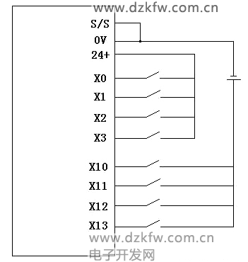 【8】老師,我想在FX3U PLC的輸入端口接入無源開關,XO—X3使用內置24V電源,而在X10—X13使用外置電源?應如何接線?
