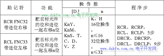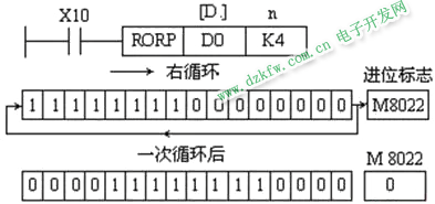 執行RCR、RCL指令時,各位的數據與進位位M8022一起(16位指令時一共17位)向右(或向左)循環移動n位。在循環中移出的位送入進位標志,后者又被送回到目標操作元件的另一端。