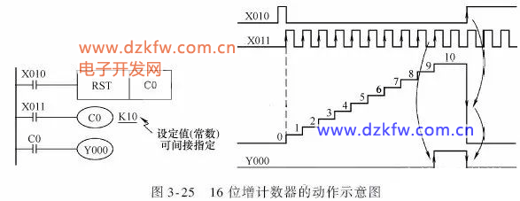 16位增計(jì)數(shù)器包括C0~C199共200點(diǎn),其中C0~C199共100點(diǎn)為通用型;C100~C199共100點(diǎn)為斷電保持型(斷電后能保持當(dāng)前值,待通電后繼續(xù)計(jì)數(shù))。16位增計(jì)數(shù)器其設(shè)定值在K1~K32767范圍內(nèi)有效,設(shè)定值K0與K1意義相同,均在第一次計(jì)數(shù)時(shí),其觸點(diǎn)動(dòng)作。16位增計(jì)數(shù)器的動(dòng)作示意圖如圖3-25所示。