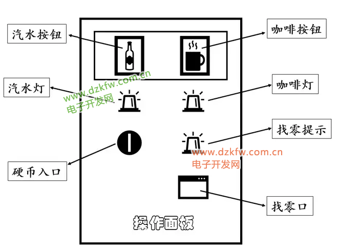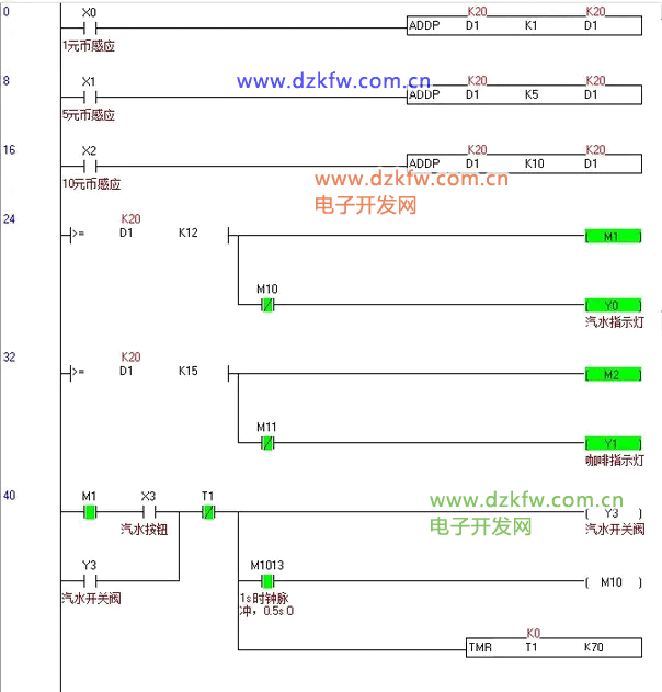 - 若對應價格飲料排出后總額還有多余的金額,則找零指示燈Y002會亮起,按下找零按鈕X005則自動退回多余的金額后找零指示燈Y002熄滅。