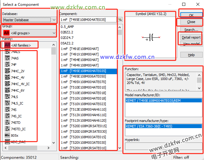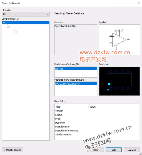 元器件符號(hào)、確定、關(guān)閉當(dāng)前界面、元件細(xì)節(jié)參數(shù)、功能描述、廠商/模型ID、引腳廠商/類型;