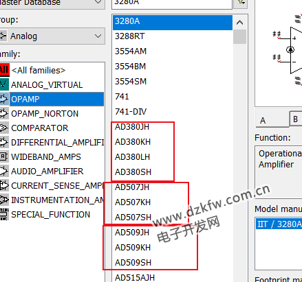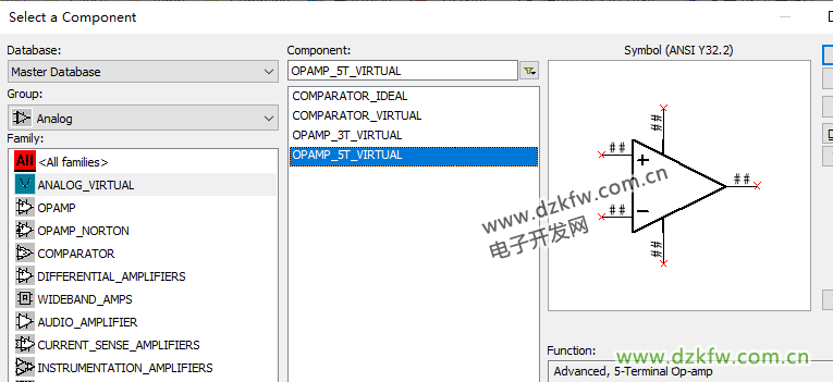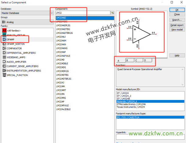 在彈出的“Select a Component”窗口中,點(diǎn)擊“OPAMP”,并選擇恰當(dāng)?shù)钠骷ㄟ@里我們以LM324AD為例),最后點(diǎn)擊“OK”。