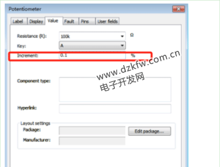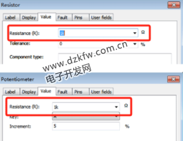 左雙擊電位器圖標(biāo),在彈出的“Potentiometer”窗口中點(diǎn)擊“Value”選項(xiàng)卡,在“Increment:”后填寫新的調(diào)節(jié)精度,最后點(diǎn)擊“OK”。