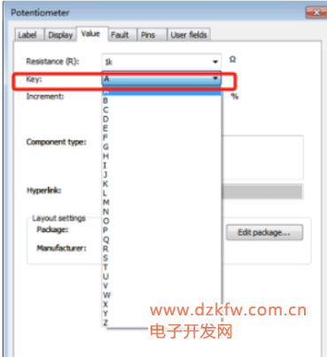 左雙擊電位器圖標(biāo),在彈出的“Potentiometer”窗口中點(diǎn)擊“Value”選項(xiàng)卡,在“Key:”后面的下拉菜單中選擇快捷鍵,最后點(diǎn)擊“OK”。
