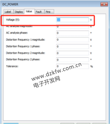 左雙擊直電壓源圖標(biāo),在彈出的“DC_POWER”窗口中點(diǎn)擊“Value”選項(xiàng)卡,在“Voltage(V):”后填寫新的電壓值,最后點(diǎn)擊“OK”