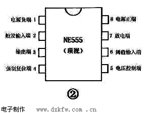 A選用NE555或μA555、LM555、5G1555等型“555”時基集成電路,它是一種模擬、數(shù)字混合集成電路,其引腳功能如圖2所示。“555”時基集成電路具有定時精確、驅(qū)動能力強(qiáng)、電源電壓范圍寬、外圍電路簡單及用途廣泛等特點,非常適合青少年電子愛好者在制作時使用。