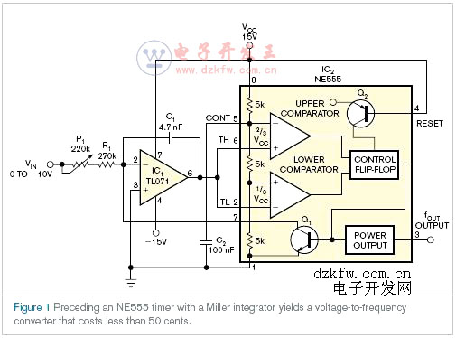 NE555定時器和Miller積分器結合組成電壓到頻率轉換器,價格低于50美分。