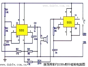 如圖所示是振蕩頻率約22KHz野外驅蚊電路圖,由左邊555合成的振蕩頻率約為22KHz,再由右邊555單穩態電路產生一個50Hz,占空比為50%的方波輸入左邊555的5腳,合成一種噪聲,用于驅趕蚊子。由NE555組成的驅蚊電路圖