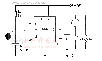 集成電路IC1是一片555定時電路,在這里接成單穩態電路。平時由于觸摸片P端無感應電壓,電容C1通過555第7腳放電完畢,第3腳輸出為低電平,繼電器KS釋放,電燈不亮。