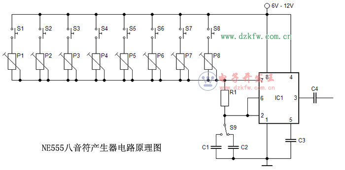 該電路是一個NE555構建的非穩態多諧振蕩器。開關S9進行一個“八度”的切換。P1至P8調節各個音符頻率。