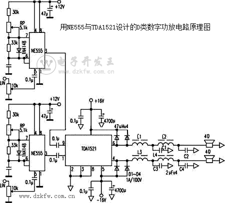 電原理見圖。NE555時基IC被接成振蕩頻率120kHz、占空比50%的方波振蕩器。音頻信號由⑤腳輸入時,③腳的輸出信號占空比就會隨著輸入音頻信號的幅值高低而作線性變化。該信號經TDA1521功率放大后再經L1~L4、C1~C4構成的濾波電路還原音頻信號。快恢復二極管D1~D4用以保護TDA1521免受L1~L4自感電勢的損壞。由于IC都是工作于開關狀態,因而可以高效率地輸出大功率。