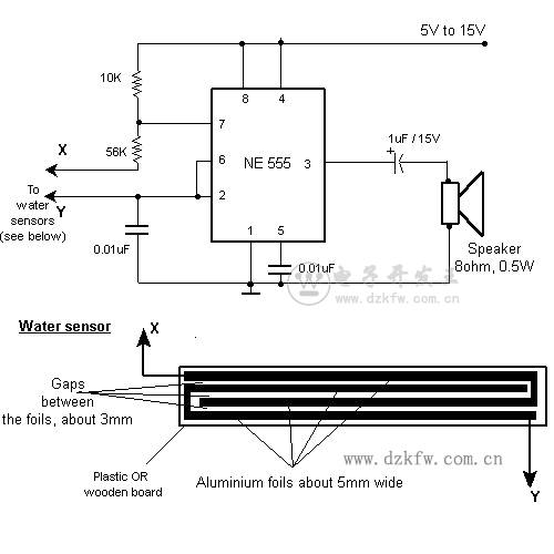 這個下雨告知器電路很簡單,555時基集成電路組成一個多諧振蕩器,經由2、7兩引腳外接的傳感器觸發。當雨點落到傳感器上時,將觸發555構成的多諧振蕩器起振,由揚聲器發聲達到提醒的目的。