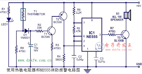 使用熱敏電阻器和NE555消防報警電路圖與零件清單