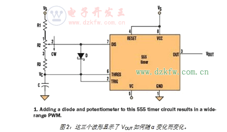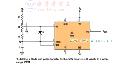 圖1:在555定時器電路中增加一個二極管和電位計可構(gòu)成一個寬范圍PWM