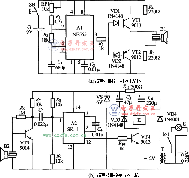 超聲波具有不可見,且不會對家用電器造成干擾等優(yōu)點,所以在有些場合下很受人們的青睞。如圖所示為一個實用的超聲波遙控燈開關,它由超聲波遙控發(fā)射器與接收器兩部分組成。超聲波遙控發(fā)射器電路見圖(a),NE555時基電路A1組成頻率約40kHz的自激多諧振蕩器,電信號由③腳輸出經(jīng)VT1、VT2放大驅動超聲換能器B1向空中輻射超聲遙控指令。RP1是微調電阻,調節(jié)它可微調振蕩頻率,使其正確工作在40kHz。超聲波遙控接收器電路見圖(b)。它由超聲接收換能器B2、前置放大器 VT3、聲控專用集成電路A2、電子開關和電源電路等部分組成。
