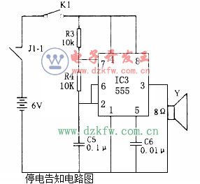 斷電告知器主要由IC3和R3、R4、C5等組成的多諧振蕩器控制。合上開關K1,當市電停電時,繼電器J1釋放,觸點J1-1閉合,IC3因得電而起振,振蕩頻率約為1000Hz,輸出信號驅動揚聲器發聲,告知主人停電了。