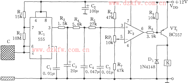 當人體接近感應金屬板C時,對地的感應電容增加,使555時基電路組成的無穩態多諧振蕩器起振或使振蕩頻率發生變化,輸出的交替方波經三級積分網絡后,加至IC2(LM324運放)比較器的同相端,與設定的參考電壓比較,輸出一個跳變的負脈沖,VT1導通,繼電器K吸合,接通負載電路。反之斷開。感應板尺寸的選擇,應使振蕩頻率不低于幾千kHz。