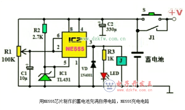 圖中的S為大電流的微動開關。按下S,整個電路得電工作,由于剛接通電源時,C1兩端電壓為0,故NE555的②⑥腳為低電平,其輸出端③腳輸出為高電平,繼電器J得電工作,其常開觸點閉合,蓄電池開始充電(圖中的+V為充電器的輸出電壓)。LED為充電指示燈,在蓄電池充電期間,LED一直點亮。當蓄電池充滿電時,NE555的②⑥腳電壓>2.5V,此時NE555的③腳輸出為低電平,繼電器失電停止工作,蓄電池停止充電,同時LED熄滅。蓄電池的充滿電壓可由電阻R1調整,改變其阻值即可使電路在所需的電壓下自動停止充電。