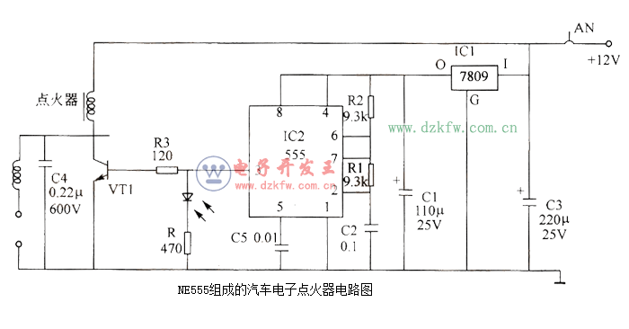 如圖所示是由NE555定時電路、穩壓器、電阻電容等組成的汽車電子點火器電路。本電路主要是利用汽車上的+12V電源,給汽車進行電子點火。